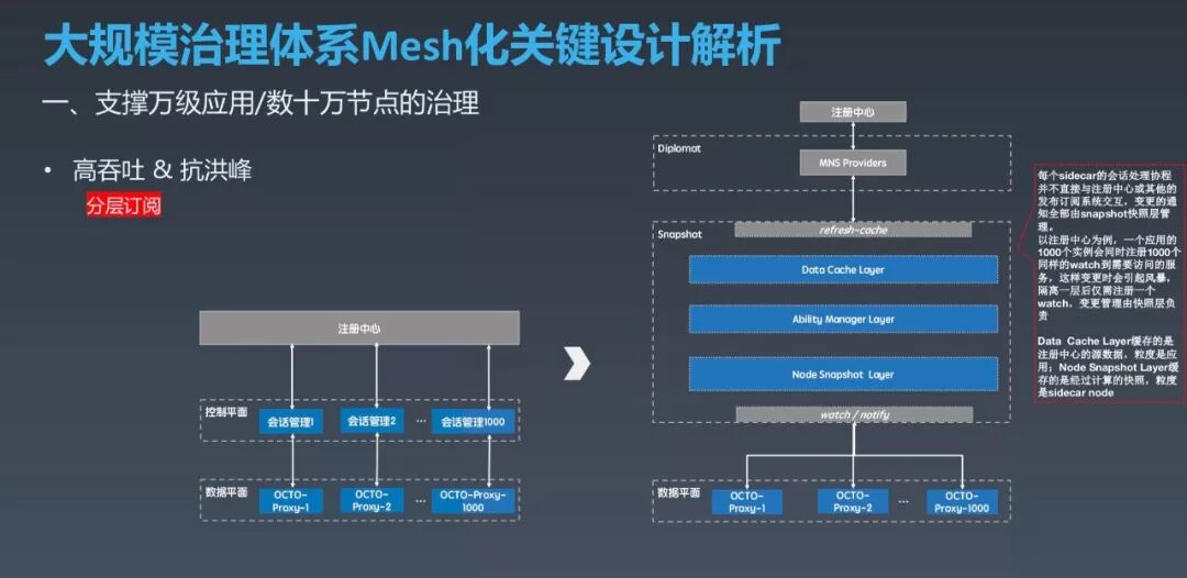 - 控制面每个节点并不承载所有治理数据,系统整体做水平扩展,在此基础上提升每个实例的整体吞吐量和性能。